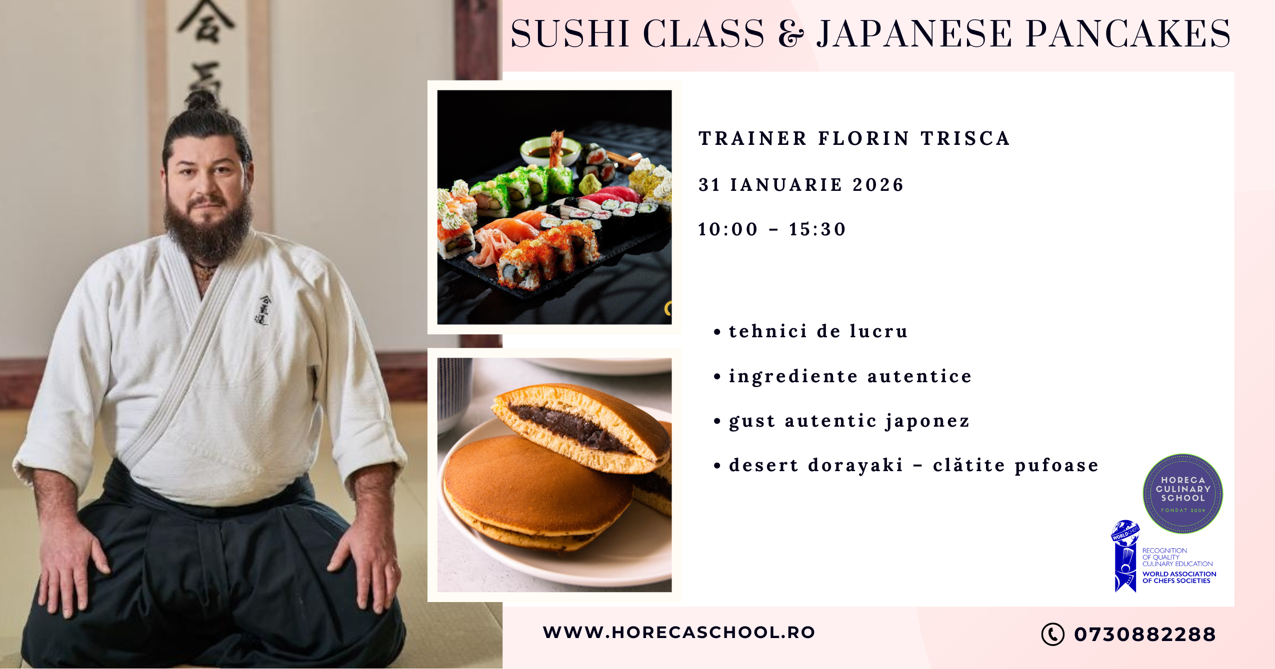 Fondator al Centrului de Cultură Japoneză Nobori din București și pasionat declarat de arta culinară japoneză, Florin face parte din echipa de traineri Horeca Culinary School și te va ghida pas cu pas, cu răbdare și multă pasiune.